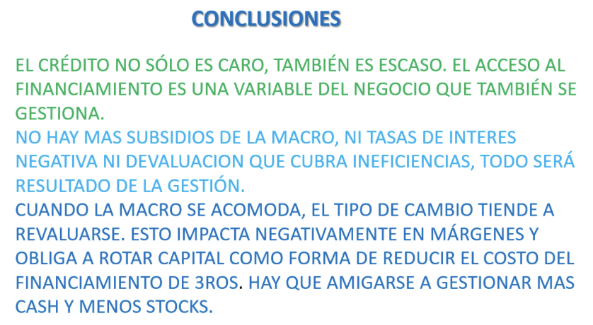 • Andar livianito: rotar inventarios, evitar contramargen financiados con deuda y priorizar la liquidez de la compañía.
