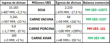 El siguiente cuadro muestra el ingreso y egreso de divisas (millones de dólares) entre enero y septiembre 2025 de estos complejos, mostrando entre paréntesis el crecimiento o recorte respecto a igual período del 2024. Las divisas ingresadas por el complejo sojero crecieron 3,3 % mientras el egreso de divisas mermó en -17,5 %, con un ingreso de divisas que superó al egreso en casi 13 mil millones de dólares. La carne vacuna, que había exportado menor volumen este año, ingresó 23 % más divisas que en 2024 por exportaciones, aunque también egresó 242 % más divisas por importaciones, la balanza comercial sigue resultando positiva para carne vacuna en más de tres mil millones de dólares. En línea con los volúmenes exportados e importados de carne porcina, las divisas ingresadas por exportaciones porcinas bajaron -15 % mientras las egresadas por importaciones subieron casi 300 %, la balanza comercial 2025 resulta negativa en -131 millones de dólares. Por último, los ingresos y egresos de divisas por exportaciones e importaciones de carne aviar crecieron en 2 % y 192 % respectivamente, resultando en una balanza comercial positiva en 96 millones de dólares.