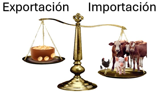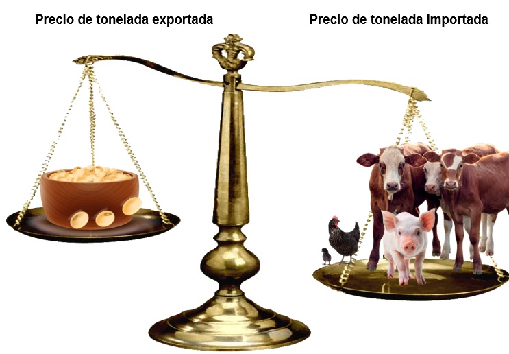 Si pudiera representarse el resultado de la balanza comercial en una balanza que pesara estos cuatro complejos agroexportadores, podría verse como el siguiente dibujo, donde las toneladas y divisas exportadas por el complejo sojero, vacuno y aviar pesan más, mientras la balanza comercial negativa del complejo porcino tiene un peso inferior.