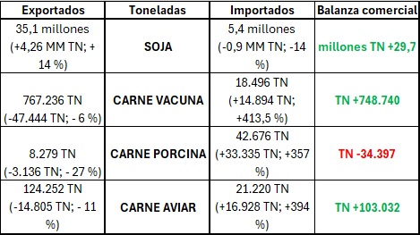 En el siguiente cuadro se observan los volúmenes exportados e importados desde enero a septiembre 2025 del complejo sojero (granos, harinas, aceites), carne vacuna, porcina y aviar. Cada dato muestra abajo y entre paréntesis la diferencia con el mismo período del año anterior, enero a septiembre 2024, y la proporción que esa diferencia representa en porcentaje de crecimiento o decrecimiento. La balanza comercial solo resta a las exportaciones las importaciones.