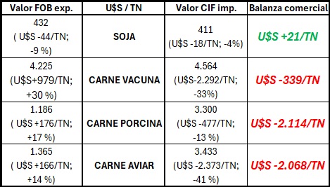 No puede decirse lo mismo cuando se observa el precio de la tonelada de cualquiera de las tres carnes, vacuna, porcina y aviar, que es superado por el precio importado en los tres casos, con mayor diferencial en carne porcina y menor en carne vacuna, pero todas las carnes son exportadas en menor valor promedio que el valor de importación, lo que significa que la composición de cortes, empaques, etc., de la carne exportada es inferior que la importada. Si se vuelven a ubicar los cuatro complejos agroexportadores, esta vez en función del precio de la tonelada exportada versus importada, puede decirse que pesan mucho más los diferenciales negativos del precio de tonelada de carnes respecto al diferencial positivo de soja.