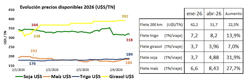 Tomando uno de los precios disponibles de enero y el último precio de abril, se calcula el costo de flete a 400 km en toneladas de granos, para una carga de 30 toneladas.