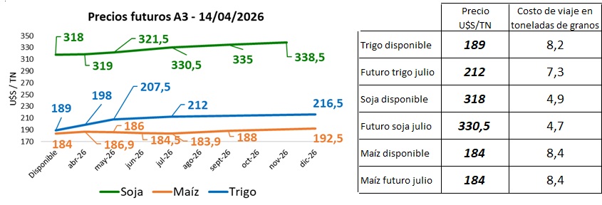 En el gráfico pueden verse los precios futuros A3 al cierre del 14/04/2026, para ejemplificar se toman los futuros a julio de soja, maíz y trigo, además de continuar con el valor del flete a 400 km y cargas de 30. Dadas las subas en soja y trigo, puede verse como el costo de flete en toneladas de granos baja respecto al disponible, de 4,9 a 4,7 toneladas de soja por viaje, y de 8,2 a 7,3 toneladas de trigo por viaje. Maíz, sin embargo, al cotizar prácticamente al mismo valor en julio, no muestra ventajas por diferir mercadería.