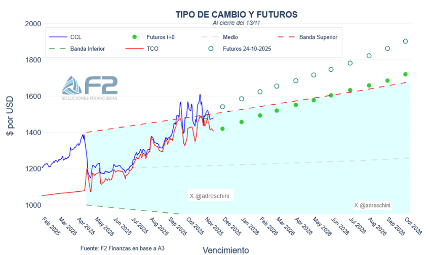Este nuevo escenario dejó al gobierno mejor parado de lo que se esperaba términos parlamentarios para llevar adelante su agenda de reformas y consolidar el apoyo de Estados Unidos. De todos modos, los compromisos que Argentina debe honrar no desaparecen y las divisas que tanto el Tesoro (argentino) como BCRA perdieron para abastecer a la demanda pre electoral deben ser recompradas, y todavía más dado que hay que cumplir con la meta de reservas de FMI y los pagos de deuda. Por ello las dudas en torno a la efectividad del esquema continúan más allá de que el gobierno lo ratifique. Pero hay factores que ayudan desde el lado de la oferta como la reanudación de las emisiones de deuda corporativa y subsoberana que aprovecharon para lanzarse a la cacería de “optimismo” y van consiguiendo colocaciones en el mercado internacional más ambiciosas con plazos superiores a 10 años y tasas de un dígito. Además, comienza a llegar a los puertos una muy buena cosecha de trigo y la demanda estacional de pesos se acentúa lo que puede acelerar el inicio de la recompra de reservas que el vicepresidente el BCRA ya adelantó. La inflación de octubre confirmó una pausa en la desaceleración pero también que el pase a precios fue relativamente acotado por lo que probablemente el gobierno aproveche esta ventana de mayor oferta de divisas para fortalecer su posición en reservas manteniendo un tipo de cambio relativamente estable para no desalentar al sector exportador. A su vez vuelve a la carga buscando consolidar el “perdón fiscal” para que puedan volcarse al sistema los dólares “del colchón” y apunta a desarmar lo que resta del andamiaje de restricciones cambiarias. Las bandas imprimen rigidez y si la inflación no desciende pronto el tipo de cambio real está sentenciado a apreciarse por lo que, en algún momento debemos ir a un esquema de flotación. GRAFICO DE ITRCM Y CUENTA CORRIENTE Por ahora el gobierno lo ratifica y, como fue señalado, hay factores que le permiten seguir con vida, aunque nada está 100% garantizado y quizás no esté del todo clara la estrategia del Tesoro para hacerse de divisas, más allá de lo que logre comprar la autoridad monetaria. Mientras tanto, el mercado de futuros y las proyecciones del REM pasaron a asignar mayores chances de que el tipo de cambio se mantenga dentro del rango entre bandas en los próximos meses. Gráfico BANDAS