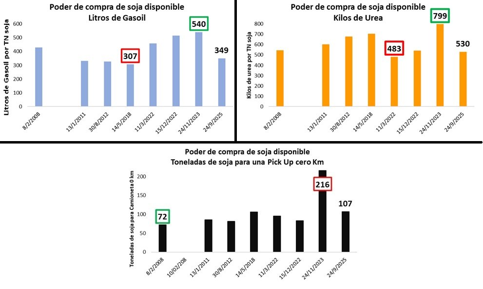 Una de las formas de interpretar con mayor claridad la oportunidad de vender soja a buen valor es convertir el precio de cada tonelada en cantidad de insumos productivos o bienes de inversión, dado que la evolución de estos puede acompañar o incluso superar las subas del precio de los granos, es la relación conocida como insumo/producto. Dos de los insumos más usados como indicador de poder de compra de los granos es el gasoil y la urea granulada.