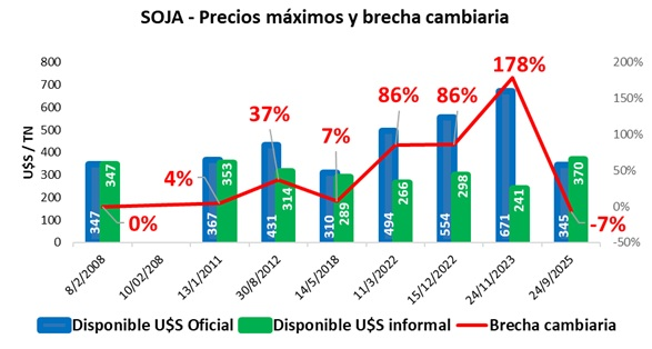 El gráfico muestra que, en contextos de brechas cambiarias altas, los precios expresados al tipo de cambio oficial se alejan fuertemente de su valor real en dólar billete. El caso más extremo ocurrió en noviembre de 2023, con una brecha del 178 % entre ambos tipos de cambio (U$S 671/TN versus U$S 241/TN). En contraste, en el pico de 2025 la brecha fue negativa (-7 %) debido a la quita temporal de retenciones y a un tipo de cambio informal por debajo del oficial, lo que invirtió la relación de precios (U$S 345/TN versus U$S 370/TN).