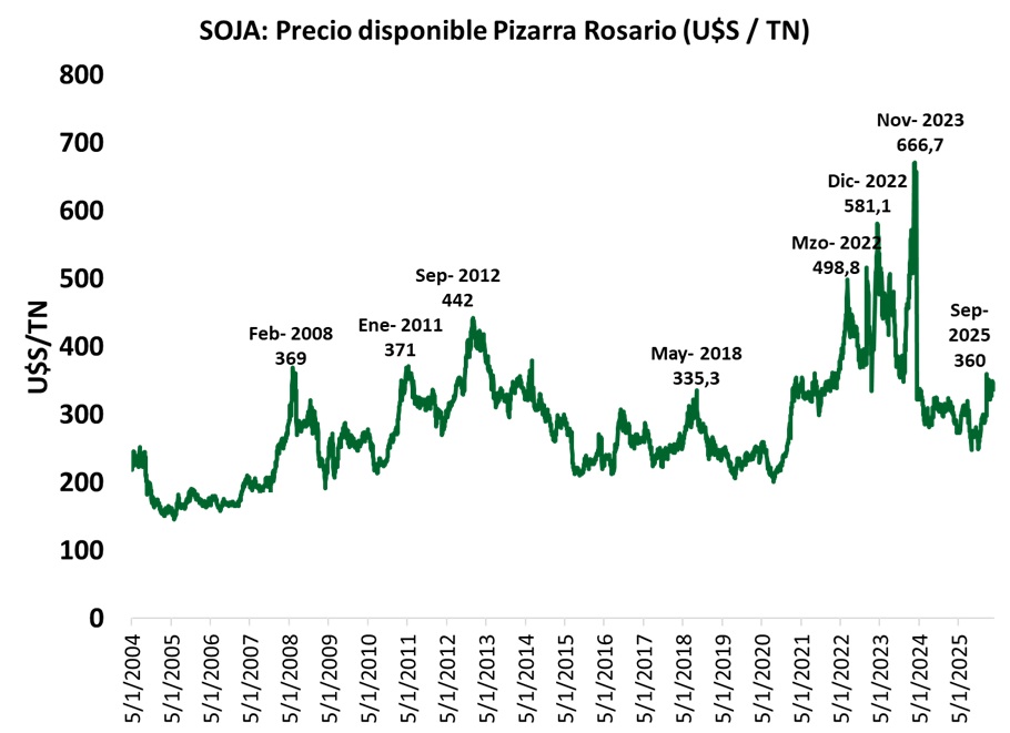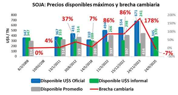 El precio disponible actual resulta en U$S 344/TN, a tipo de cambio informal resulta en U$S 346/TN, con una brecha del -0,7 %, puede decirse que la brecha cambiaria tiende a cero. Considerando el precio promedio de la soja disponible 2025 hasta ahora en U$S 299/TN, el precio actual cotiza U$S +45/TN, lo que representa una mejora del 15 %, si bien no es un precio máximo, supera con importante proporción al promedio.