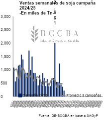 A la fecha se llevan comercializadas alrededor de 38,5 millones de toneladas de soja correspondientes a la campaña 2024/25, lo cual representaría el 75% de la producción estimada a nivel nacional (51,1 Mill Tn de acuerdo con la Secretaría de Agricultura, Ganadería y Pesca de la Nación). En comparación a periodos anteriores, el actual ritmo de comercialización se posiciona diez puntos porcentuales por encima del observado durante el ciclo comercial previo (65%) y seis puntos porcentuales por encima del promedio de las últimas cinco campañas (69%).
