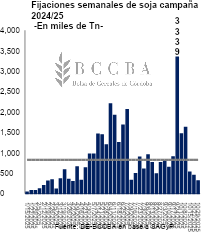 Hasta la semana del 29 de octubre, alrededor de 35,4 millones de toneladas correspondientes a la campaña 2024/25 se encuentran con precio, representando el 91% del total comercializado (38,5 Mill Tn). Lo cual, dejaría un remanente de 15,7 millones de toneladas sin fijar, poco más del 30% de la producción total (51,1 Mill Tn).