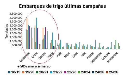En el siguiente gráfico puede verse la distribución de embarques de trigo de las últimas ocho campañas desde diciembre de un año hasta noviembre del siguiente. Más de 50 % del volumen total exportado se embarca entre diciembre y marzo, es decir, en el primer cuatrimestre del ciclo comercial, distribuyéndose menos del 50 % durante los otros dos cuatrimestres.
