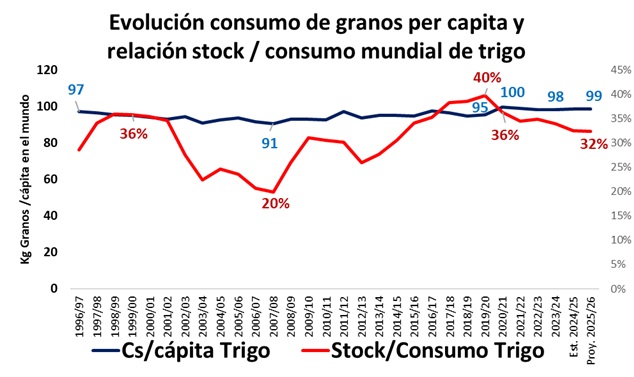 El consumo mundial de trigo ha crecido más de 40 % las últimas tres décadas, pasando de más de 570 millones de toneladas (MM TN) desde la campaña 1996/1997 a 815 MM TN según se proyecta para la presente 2025/2026. La producción también creció en proporciones similares durante este período, pasando de más de 580 MM TN a 816 MM TN. Crecimientos de producción más acelerados que el consumo permitieron acumular stocks de trigo durante varios años, así como mayor consumo que producción redujo dichos stocks en otros. La relación stock / consumo indica la proporción de cereal que queda sin consumir en cada campaña en función del consumo durante la misma, y en el gráfico puede verse como, de niveles mínimos de stock que representaban 20 % del consumo en la campaña 2007/2008, se alcanzaron stocks tan elevados que representaron 40 % del consumo mundial de trigo en la campaña 2019/2020, para decrecer luego a niveles de 32 % como se proyecta para la presente 2025/2026.