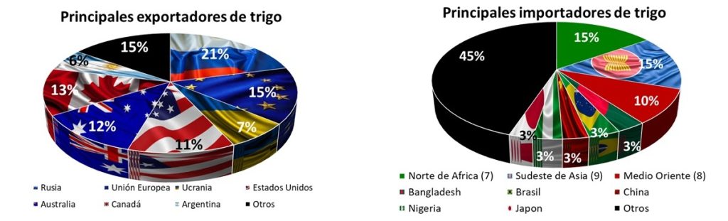 Por otro lado, si bien el trigo es el cereal que se cultiva en mayor diversidad de ambientes en el mundo, muchos países consumidores no producen nada, como es el caso de japón, o muy poco en función de su población, como es el caso de países de Asia y África. En los dos gráficos a continuación pueden verse los principales productores y exportadores a la izquierda, y principales importadores a la derecha. Se observa que 43 % del trigo exportado en el mundo proviene de Rusia, Ucrania y Unión Europea, mientras 52 % del trigo que se importa en el mundo tiene por destino países de Asia y África, lo que indica porque es tan importante esa parte del mundo en la determinación de precios internacionales de trigo. También se observa la lejanía de Argentina, que provee 6 % del volumen total exportado en el mundo, respecto a la mayoría de los países importadores, a excepción de Brasil, y esto exige mayor competitividad en calidad y/o precio para salir al mundo.