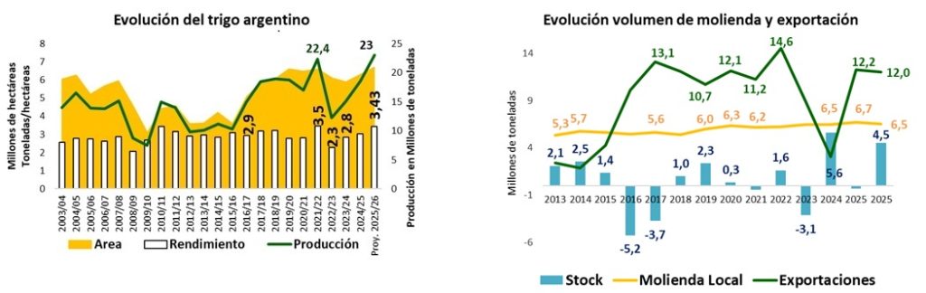 La historia reciente del trigo argentino muestra una evolución creciente en medio de un mercado global de abundancia. En el gráfico de la izquierda se observa el crecimiento sostenido de superficie sembrada por encima de 6 millones de hectáreas desde la campaña 2017/2018 en adelante, con rendimientos promedio nacionales que han alcanzado 35 qq/ha, y cosechas que han roto el techo de 20 MM TN. La superficie sembrada en la presente campaña 2025/2026 resulta récord para las últimas décadas, en 6,7 millones de hectáreas, y, a pesar de haber zonas con perjuicios por anegamiento, se esperan rendimientos promedio cerca del récord de la 2021/2022 y producción por encima de 23 MM TN.